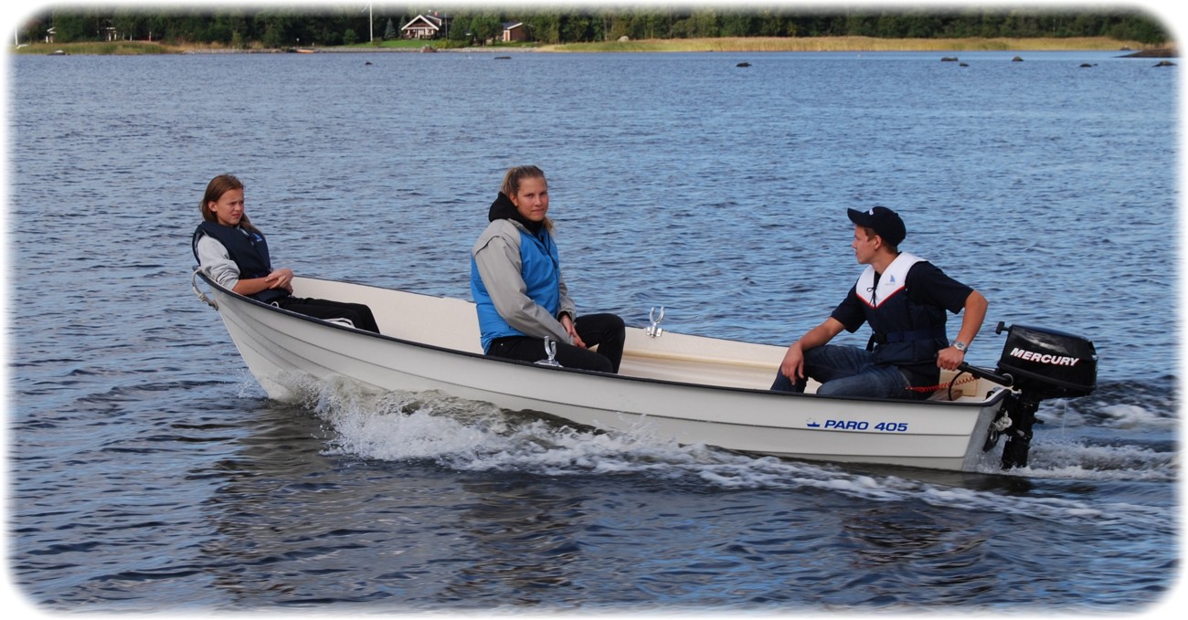 PARO 405 är en mycket säker, lättrodd och kursstabil båt, och är lämplig för kortare färder. Om aktersnurra används, är 3-6 hp lämpligt. Förvaringsutrymme för bränsletank finns under akterbänken.