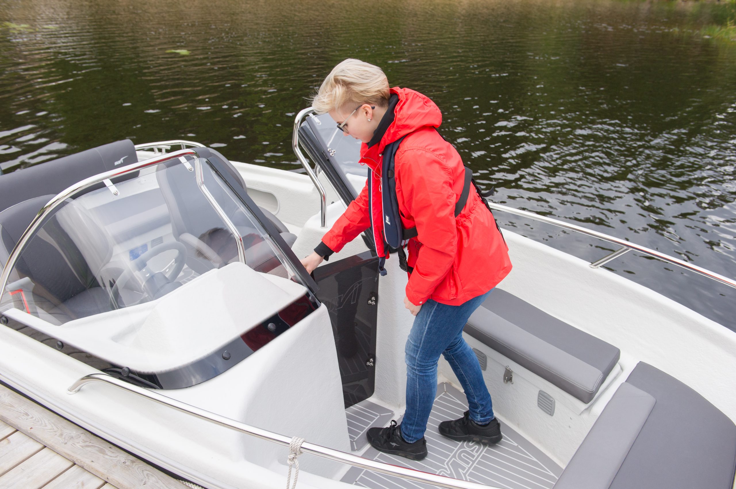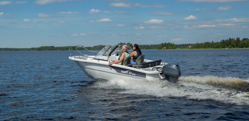 Suvi 47 Duoär en ekonomisk dubbelpulpetmodell med brett användningsområde som kan användas både som förbindelsebåt och för sommarstuge- och fiskebruk. Eftersom båten är lätt fungerar den utmärkt även med lägre motoreffekt. Det utökade utrymmet i aktern ger personer på bakbänken behövligt extra utrymme. Båtens utrustning omfattar bl.a. räcken, vindrutor och badstege. Rejält tilltagna stuvutrymmen för t.ex. kylväska eller kassar under styrpulpeterna. För långriggad motor. Utrustad med regnläns. Tvådelat kapell för akterhytten finns att få som extrautrustning.